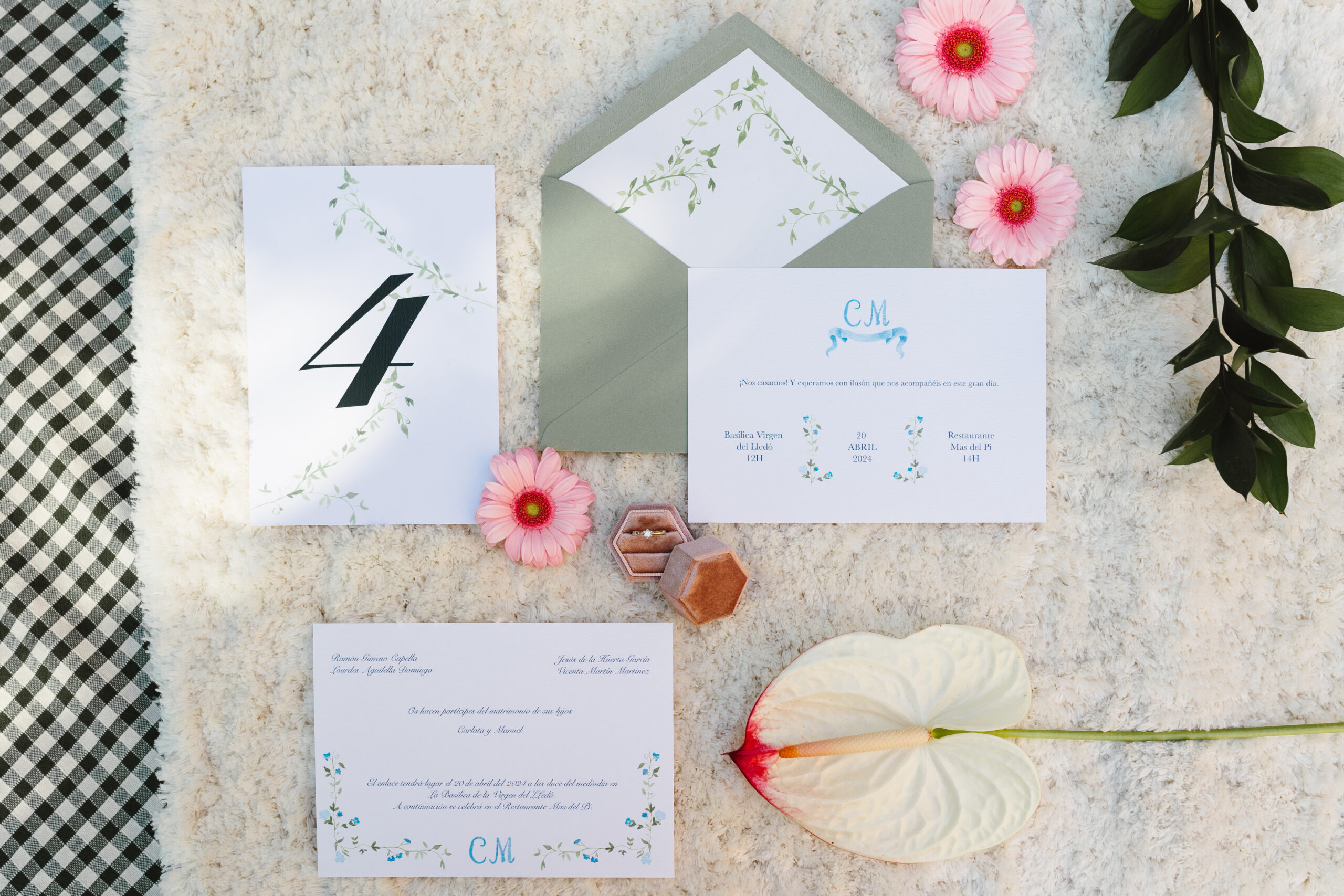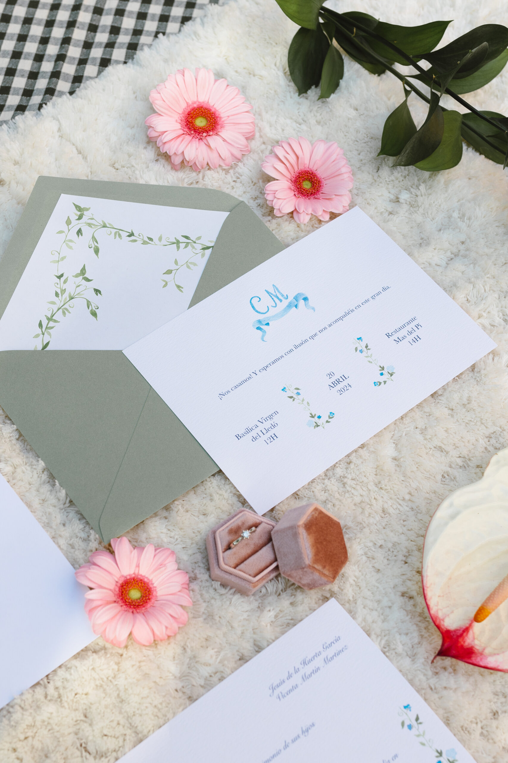 El diseño combina una caligrafía tradicional con detalles románticos, como el monograma en tonos azules y los marcos florales en acuarela.